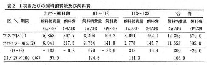 - 出荷期限の133日齢までの1羽当たりの飼料費は、フスマ給与により26円安くなる(表2)。