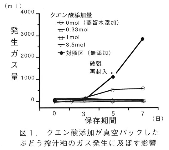- 無添加の新鮮なぶどう搾汁粕を真空パックした対照区において保存1日目からガスが発生し、保存5日目で袋は破裂し、再封入後もガスが発生し続けた。しかし、クエン酸溶液の添加により、ガスの発生はなくなり、長期保存が可能である。(図1)