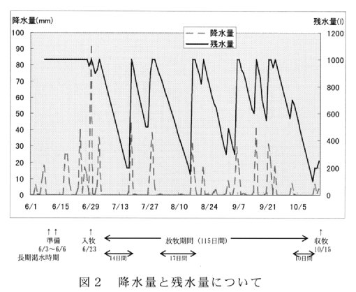 - 20日間に50mm以上の雨が降れば、1,000 Lの営農タンクで飲水の補給をすることなく、成牛2頭の放牧が可能である(図2)。