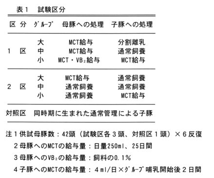 - 子豚離乳時体重は中及び小グループの母豚へMCT及びビタミンB2 (VB2 )の給与を行った1区が2区の同グループに比べて増体性が改善された(表2)。