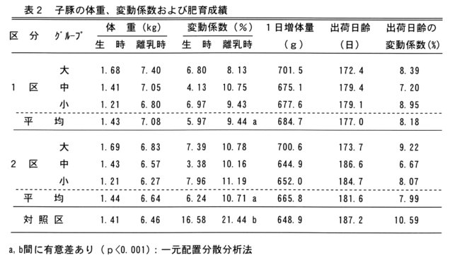 - 子豚離乳時体重の変動係数は1区及び2区が対照区の21.44%に比べて有意に改善し、それぞれ、半減した。また、1区の大グループの離乳時変動係数は分割離乳により2区の大グループに比べて2.65%改善された(表2)。