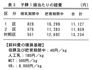 - 試験期間中の子豚1頭当たりの経費は、授乳期間中で1区及び2区が対照区に比べて、それぞれ227円及び25円高くなったが、肥育期間中を含む合計では出荷日齢の改善により、1区及び2区が対照区に比べて、それぞれ2,107円及び1,375円少なくなった(表3)。