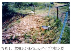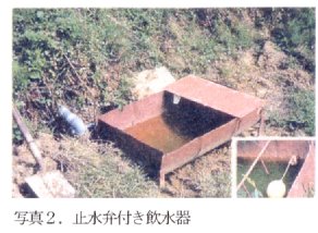 1)排水不良:飲用水が流れ出るタイプの飲水器(写真1)は、流れ出ないように止水弁付き飲水器(写真2)に変える。また、排水溝を設置する。