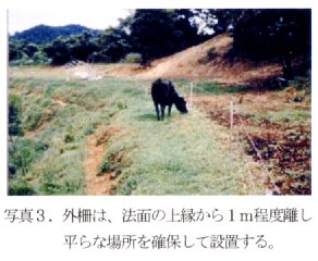 2)牧柵の設置場所:法面の上縁に設置してある牧柵を、外柵については法面の上縁から1m程度離して牛が歩ける平らな場所を確保して設置しなおし(写真3)、内柵は撤去する。