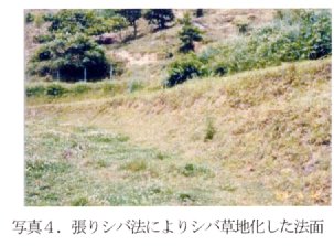 4)法面のシバ草地化:裸地化した法面に対して、張りシバ法(シバ苗を生牛糞(糊として利用)を用いて、1枚/㎡法面に張り付ける)により崩れている法面にシバを導入する(写真4)。