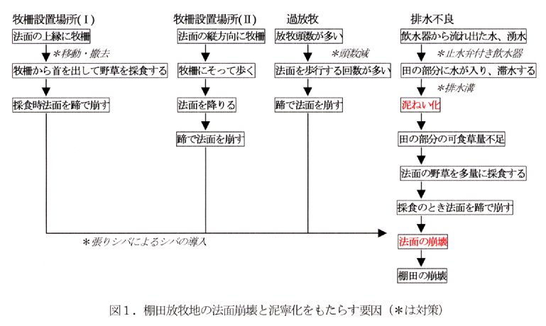 - この要因がどの様な過程を経て棚田の法面崩壊と泥濘化を引き起こすかを図1に示した。排水不良を例にとると、飲水器から流れ出た水は、棚田に流れ込み、排水不良のため滞水し、泥濘化を引き起こす。このため、田の部分の可食草量が不足し、牛は法面の野草を多量に採食する。このとき、採食のために法面を歩行する回数が増すので、法面は蹄によって崩され、崩壊が始まる。