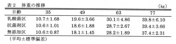 - 乳酸菌区の子豚の増体量は、各週齢とも無添加区を上回り、抗菌剤区と同等の成績である(表2)。