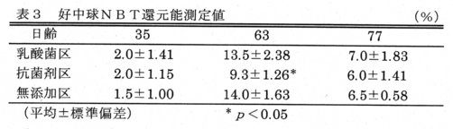 - 乳酸菌区と無添加区の好中球NBT還元能は、63日齢で抗菌剤区に比べ有意に増加する(表3)。