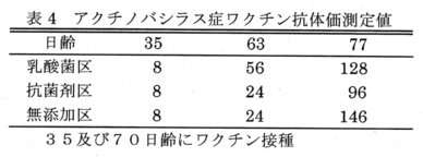 - アクチノバシラス症ワクチンを35及び70日齢に接種したところ、抗体価に有意差は認められない(表4)。