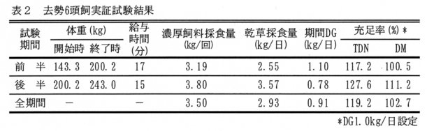 - 6頭飼い群飼去勢子牛2群において、前半17分、後半15分の設定で採食時に各牛の首出しができる条件下で実証試験を行ったところ、TDN及びDM充足率はそれぞれ119.2%、102.7%で、平均期間DGは0.91kgの発育である(表2)。