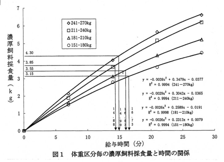 - 2頭飼いの離乳去勢子牛延べ172頭について、体重を151kgから30kg毎に4区分し、給与開始から7分毎に28分まで経過時間当たりに採食する濃厚飼料(子牛育成用配合飼料:TDN69%、DCP12%)量を測定し、採食時間と濃厚飼料採食量との間に2次回帰曲線を求めた。それを基に1日当たり増体量(DG)1.0kgを基準とした体重区分毎の濃厚飼料必要量を算出し、1回当たりの採食時間を求めると、農家段階で応用する場合、4~5カ月齢(150kg程度)で離乳後1~8週は17分、9~16週は15分と設定できる(図1)。