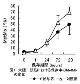 - そこで、好ましい肉色を小売り段階で保持させるために、抗酸化剤であるビタミンE(酢酸-dl-α-トコフェロール)を雌牛の飼い直し肥育中(平均78日間)に1,000mg/頭/日給与し、得られた筋肉部位をステーキ状に整形して、4℃、暗所で保存し、その間の肉色変化をメトミオグロビン形成割合(MetMb)を指標に検討した。