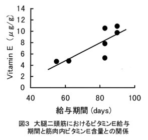 - 胸最長筋では、大腿二頭筋とは逆に給与区の方が対照区に比べて、その差は小さいものの、MetMbが有意に高く、筋肉部位によりビタミンE給与の効果が異なる(図2)。