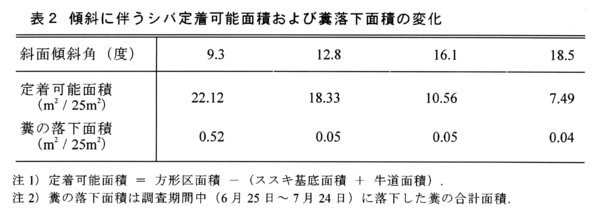 - シバの定着可能面積は斜面傾斜角の増加に伴って急激に小さくなる傾向にあり,侵入種子量を規制する糞の落下量も斜面傾斜角の増加に伴って急激に少なくなる傾向にある(図1,表2)。