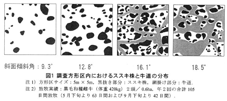 - シバ草地の保全的造成法の一つとして,放牧牛の糞中種子を利用した種子散布が考えられている。しかし,傾斜地では放牧圧(採食・踏圧・排糞)の分布が地形の影響で不均一となるため,その効果は地形によって一様ではないと考えられる。その実態を傾斜ススキ型草地において検討する。