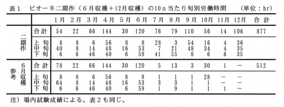 - 作業は、一作目時は4月と6月に、二作目時は9月と12月にそれぞれ労働ピークを形成するが、一方の作が他方の作の労働ピークを押し上げることがなく、既存の加温一作型(6月収穫)の1.7倍の労働量の増加で済む(表1)。