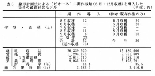 - 以上の結果を基に線形計画法で最適経営モデル(家族労働力 2.5人)を作成すると、本県の各既存作型だけによる経営モデルの1.6倍に相当する 9,036千円の所得が可能になることから、ピオーネ専作によるブドウ作経営の展開に大きく寄与する栽培法である(表3)。