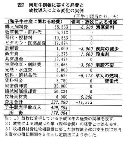 - 肉用牛飼養に要する労働を除く経営費は、繁殖牛の濃厚飼料費、削蹄費、疾病減少による診療衛生費、及び草刈り作業の減少による燃料費や替歯代が1頭当たり約19千円節約された。一方、電気牧柵等の資材費や疾病予防の衛生費が新たに生じ、両者を相殺した費用の減額は、1頭当たり約12千円である(表2)。