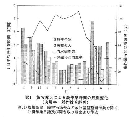 - 放牧導入により、年間の給餌・掃除及び敷料調達の労働時間は約26%、野草等の粗飼料調達に関わる労働時間は約45%、家畜飼養と稲作を併せた総農作業時間は約22%減少した(表1)。とくに、労働強度の高い農作業の多い4~9月の1日当たり労働時間が40~73%に著しく軽減したことは注目される(図1)。