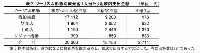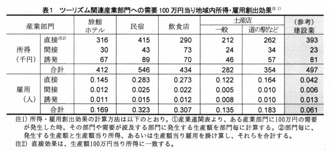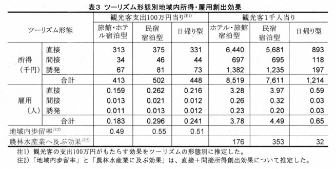 - 結果は以下のとおりである。(1)観光客支出100万円が創出する雇用は0.2~0.3人、所得は50万円弱にすぎない(表3)。これは地域外からの原材料仕入割合が高く、間接効果が低く、地域内歩留まり率が低いことによる(表3)。(2)ツーリズム形態間比較では民宿宿泊型が大きい(表3)。この要因の1つは民宿部門の所得率が高いため、直接および誘発効果が大きいことである(表3)。2つは、地域内農林水産業部門からの仕入割合が高く、間接効果が大きいことである(表3)。地域の農林水産業が零細性であるため、食材の安定仕入が要求される旅館・ホテル部門は地域外からの仕入れに依存するが、民宿部門は旬の地場食材を活用できる。(3)土産店や道の駅など商業部門への需要が創出する所得や雇用は大きくない(表1)。これは、地域外製品が販売されることや、売上の相当部分を食料品が占めるが、食料品製造部門も、原材料の安定仕入が要求されるため、地域内農林水産業からの仕入割合が低いことによる。