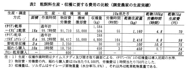 - 通年乾草生産技術の10a当たりの総作業時間及び資材の投入量・経費は、乾草-サイレージ生産技術に比べて低い(表1)。他方、現行の10a当たり乾物生産量は、乾草-サイレージ生産技術の2,416kgに対して、1,160kgと低い(表2)。このことから、通年乾草生産技術は、低収量であるが低投入の飼料生産技術であるので、耕作放棄地等遊休地を広く活用し、農地機能を保全する方法として期待がかけられる。