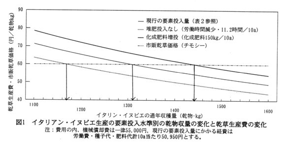 - 現行の通年乾草生産技術の要素投入量をもとに、その生産費を市販の乾草価格以下に抑えるための収量水準を試算すると、現行の要素投入量の下では10a当たり1,310kg以上、堆肥投入を行わない場合は10a当たり1,170kg以上、化成肥料を現行の3倍投入する場合は10a当たり1,440kg以上の乾物収量を確保する栽培技術が必要である(図1)。但し、通年栽培面積を天候等の制約から20aとし、小型機械導入費は2分の1助成とする。