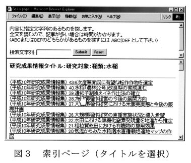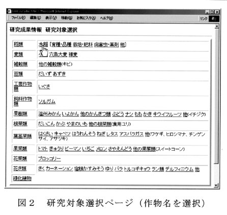- ユーザ用に検索ページを作成し、インターネット上で公開した。検索方法は簡単である。たとえば研究対象選択ページで作物名を選択する(図1、2)と、該当する成果情報タイトルの一覧が表示される(図3)ので、見たいタイトルを選択すると内容が表示される(図4)。本文中の文字列検索をするCGIスクリプトも、WWWから利用できる。