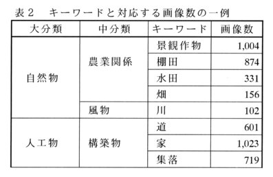 - 農村景観画像データベースは、必要な素材の画像ファイルを検索するために設定した「キーワード」を付け、表計算ソフト(EXCEL)のファイル形式で作成した。なお、代表的なキーワードの登録画像数は、集落が719、棚田が874である(表2)。