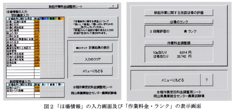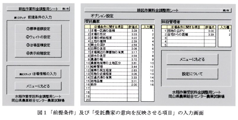 - 水稲作業受委託にともなう料金設定時において、ほ場条件や受託農家の意向を反映させた料金設定を支援するツールを作成した。これにより受託農家の意向を尊重した作業料金の設定が容易になる。