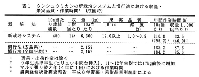 - 「興津早生」を新栽培システムで栽培すると、9年生で1樹当たり14kg、10a当たり6,300kgの収量が得られる。果実糖度(Brix)は12.0以上、酸度は1.0~0.9%の高品質果実が天候に左右されずに生産できる。選果・出荷など園外作業を除いた年間作業時間は、10a当たり210.8時間、マルチを張り替える年(4年に1回)には295.2時間である。収量1,000kg当たりに換算すると、それぞれ33.5時間、46.9時間になる。これは、慣行法の85.6(全国平均)~87.3時間(広島県)の約39%、マルチ張り替え年でも約55%に短縮される(表1)。
