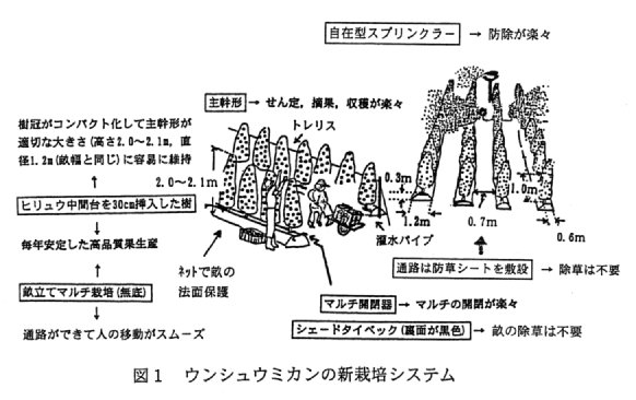 - ヒリュウ中間台、主幹形、畝立てマルチ栽培(無底)、マルチ開閉器、シェードタイベック、自在型スプリンクラー、防草シートの技術を総合的に組み合わせたウンシュウミカンの新栽培システムは、高品質果実生産と省力化を同時に実現する。