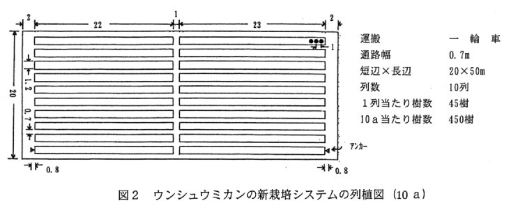 - 園内の運搬手段は一輪車(人力)で、通路の幅は0.7mとする。短辺20m×長辺50m(10a)の圃場では、450樹(10列×1列当たり45樹)栽植できる(図2)。