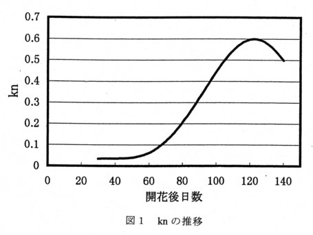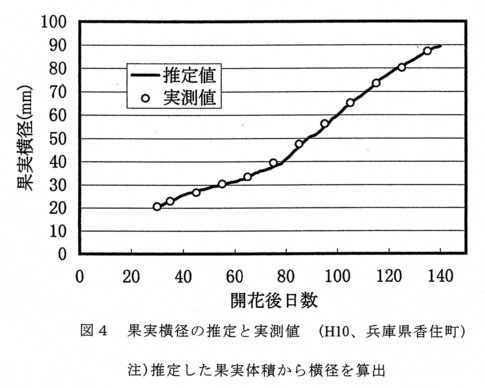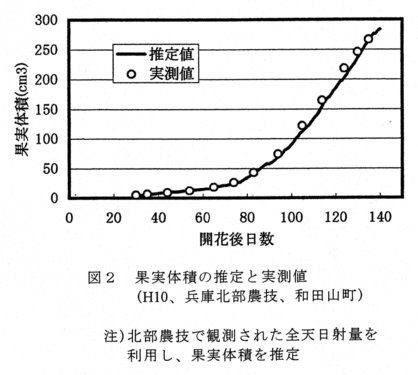 - 「幸水」の肥大モデルによると1日当たりの果実体積生長速度FVGR( Fruit Volume Growth Rate)(cm3 /day)は、FVGR=kn・Sdb ・V33 p (kn:係数、Sd:日射量(MJ/㎡/day)、V33 :満開後33日目の果実体積(cm3 ) (V=W2 ・h・π/6000 (W:横径(mm)、h:縦径(mm) )と表される。