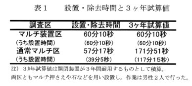 - 装置の設置時間(場内階段園1段、テラス長25m)は通常のマルチ敷設・除去時間に比べて、約3分多く要したが、装置の耐用年数を3年とすると、約110分(比率65%)削減できる(表1)。