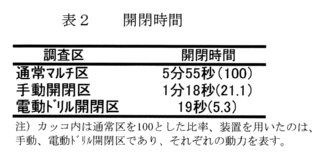 - 開閉時間(場内階段園1段、テラス長25m)は手動で約80%、電動ドリル(充電式、AC100V電源)で約95%短縮できる(表2)。