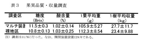 - マルチ開閉装置区では裸地区に比べて、果汁の糖度が向上する(表3)。