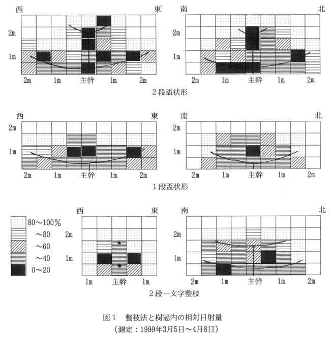 - 2段盃状形では、樹冠の下部、主幹の上部とその北側に相対日射量40%以下の部分が多く、また20%以下の部分も多い。一方、1段盃状形では樹冠内部に、2段一文字整枝では各段の主枝の下部に相対日射量40%以下の部分が多いが、いずれも20%以下の部分は2段盃状形と比べて少ない(図1)。