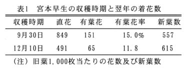- 「宮本早生」の収穫時期を遅らせると、翌年の直花数、有葉花数共に少なくなるが、新葉数には差がない(表1)。