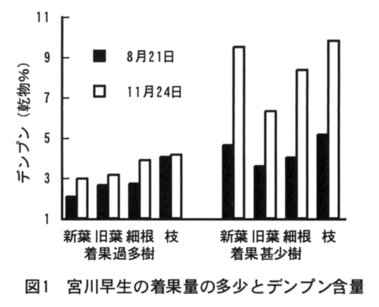 - 貯蔵養分のデンプン含量は、各器官において着果過多樹で少ない。11月には着果量が少の樹は各器官とも8月の2倍程度に増加するが、着果過多樹ではほとんど増加しない(図1)。