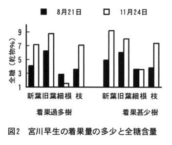 また、全糖含量は着果過多樹の細根で低いが、他の器官では差が見られない(図2)。