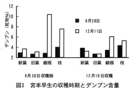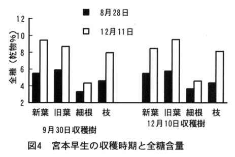 - 「宮本早生」を12月10日まで収穫時期を遅らせると、細根及び春枝のデンプン含量の蓄積が少なくなるが、全糖含量には差がない(図3、4)。