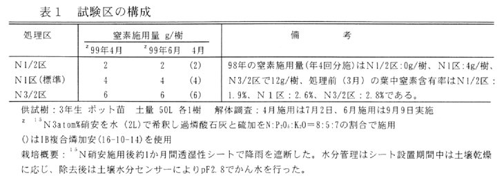 - 4月施用樹の7月における窒素含有率は、新葉等の各器官で窒素施用量が多いほど高い(表2)。