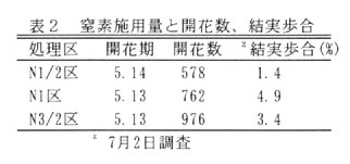 - 開花数は窒素施用量が少ないと減少し、結実歩合は窒素施用量が標準の1/2の場合に低い(表1)。