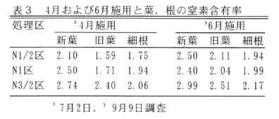 - 6月施用樹の9月における窒素含有率は、窒素施用量が標準の3/2の場合に新葉等の各器官で高く、窒素施用量が標準~1/2の場合に差はみられない(表3)。