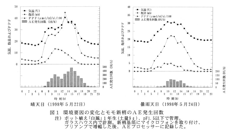 - モモ新梢の1時間当たりのAE発生回数と気温、飽差およびPPF(光合成有効光量子束)との単相関係数は、0.65~0.90(1%で有意)である(図表省略)。しかし、AE発生回数は、環境要因の変化にやや遅れて増減する(図1)。