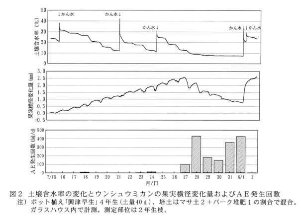 - ウンシュウミカンの1日当たりのAE発生回数は、土壌含水率が11%以上では少ないが10%以下では急増し、かん水によって土壌含水率が高まると著しく減少する(図2)。また、AE計測回数が急増する日に、果実横径の日変化量がマイナスとなる。