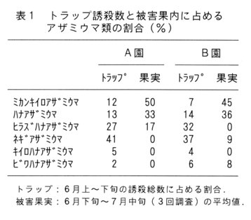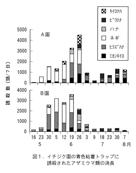 - アザミウマ類の発生消長は6月中下旬にピークとなり、その後急激に減少する。粘着トラップで誘殺数の多い種はおもにネギアザミウマとヒラズハナアザミウマである(図1)。ミカンキイロアザミウマはトラップで占める割合は低いが、果実で検出される誘殺割合が高く(表1)、被害を起こしやすい種である。