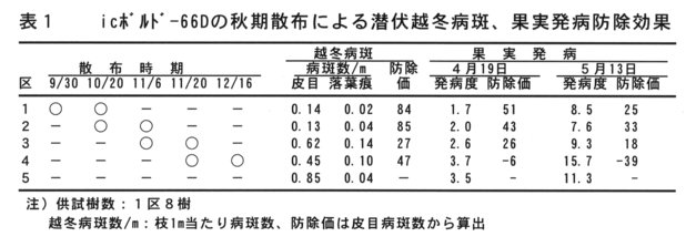 - icボルドー66Dを50倍で9月30日および10月20日、10月20日および11月6日に散布すると皮目からの感染による潜伏越冬病斑形成数が少なく、高い防除効果が得られる。果実に対する防除効果は初期にはある程度認められるが、後期発病に対する効果は低い(表1)。