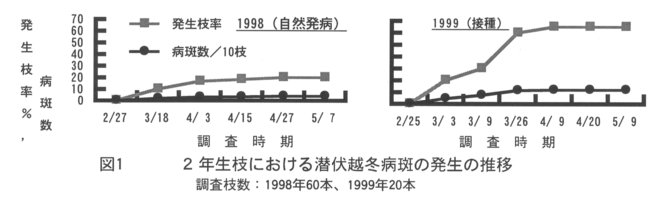 - 潜伏越冬枝病斑の形成は1998(自然感染)、1999年(接種)とも3月上中旬から認められ、4月上旬にかけて急増し、中旬以降には新たな形成はみられない(図1)。