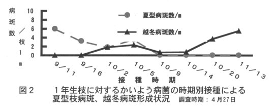 - 耕種的防除として潜伏越冬枝病斑の剪除を行う時期は、3月下旬頃が適当と思われる。